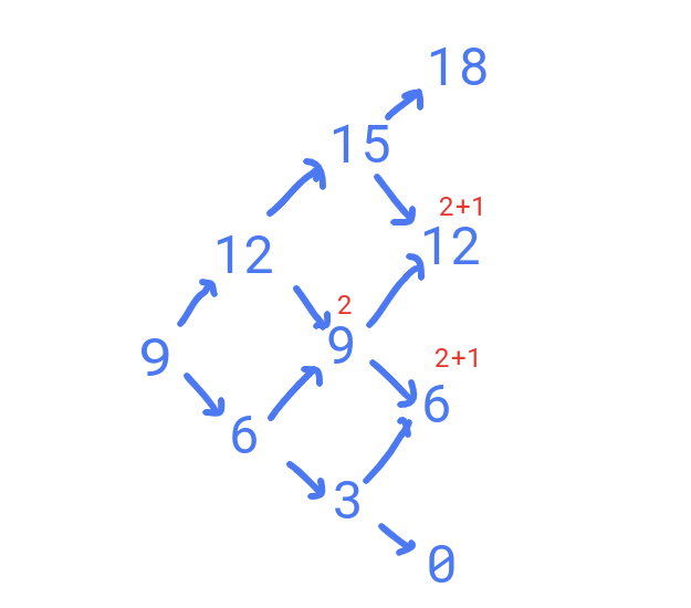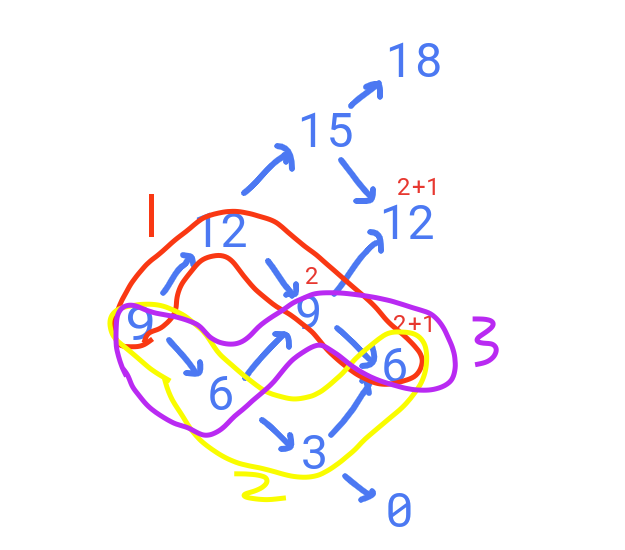 이러한 경우의 수가 나타나게 되는데 마지막 값은 6이 되야하기 때문에 18,12,6,0 에서 6까지 온 경로의 수를 구해주면 되는 것이다.