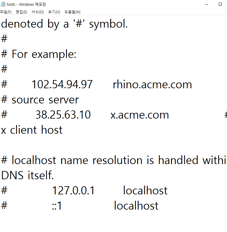 hosts 파일은 ip 주소와 도메인을 매핑해주는 파일이다. 우리가 자주 사용하는 도메인을 ip 주소로 변환하는 역할을 하는 것은 DNS Server이다. 그러나 DNS Server을 안거치고 Local에서 설정하는 방법이 바로 hosts 파일을 이용하는 것이다. hosts 파일의 우선순위가 DNS Server 보다 높기 때문에 가능한 일이다.
