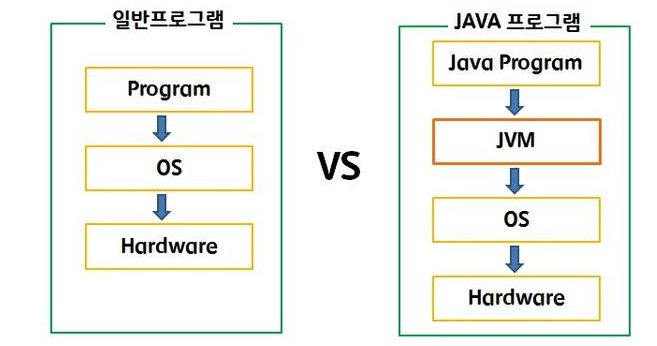- 기존 언어는 OS에 맞게 컴파일 된 프로그램이 다른 O/S로 변경되면 기존 컴파일 된 것을 재사용 할 수 없음