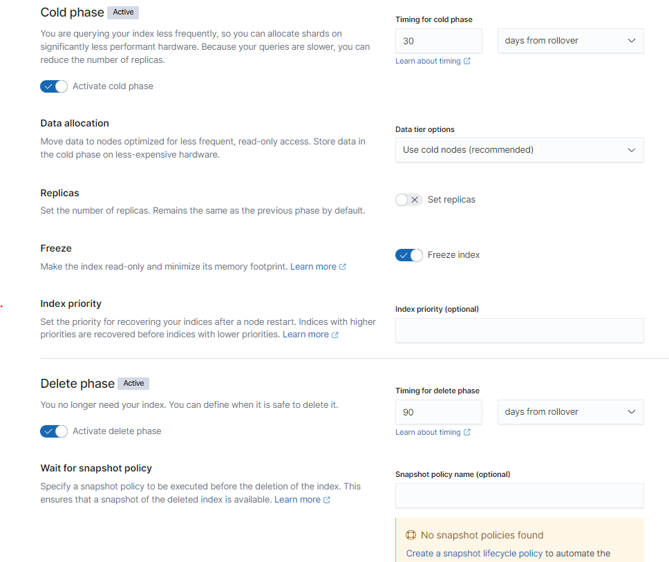Warm과 마찬가지로 cold node를 사용하고, 용량 확보를 위해 Freeze을 사용한다. (해당 인덱스는 읽기 전용으로 변경된다.)