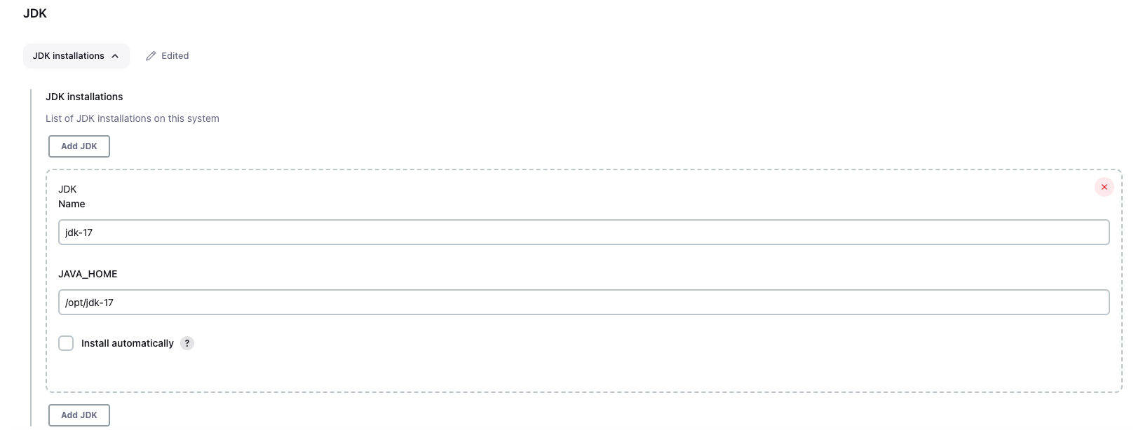 - Jenkins 관리 → Tools → JDK 들어가서 아래 내용처럼 세팅한다.
