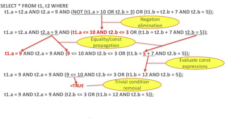 - Logical transformations : 쿼리의 논리적 구조를 분석하고, 효율적인 실행 계획을 생성하기 위해 쿼리를 변환하는 단계 즉 쿼리의 조건을 단순화 및 필요한 연산의 순서를 최적화