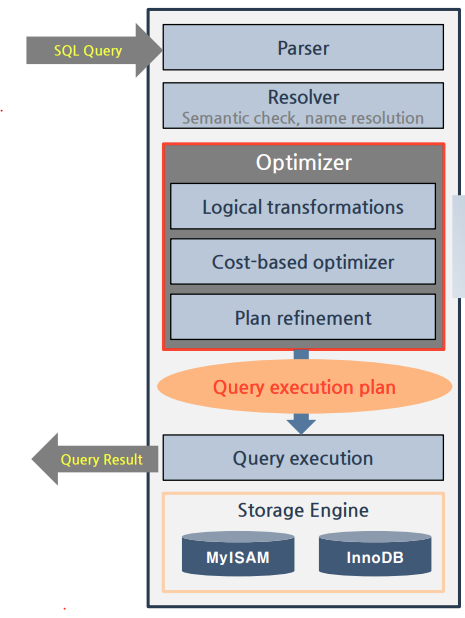 - Cost-based optimizer : 가능한 모든 실행 계획을 생성하고, 쿼리의 논리적 구조와 테이블 및 인덱스의 통계정보를 기반으로 각 계획의 비용을 추정한다.