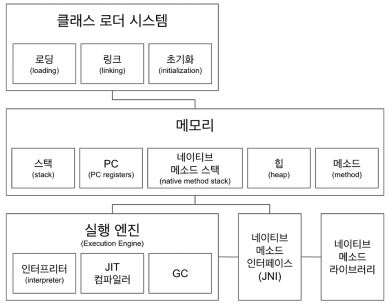 - 자바 가상 머신으로 자바 바이트 코드(.class 파일)를 OS에 특화된 코드로 변환(인터프리터와 JIT 컴파일러)하여 실행한다.