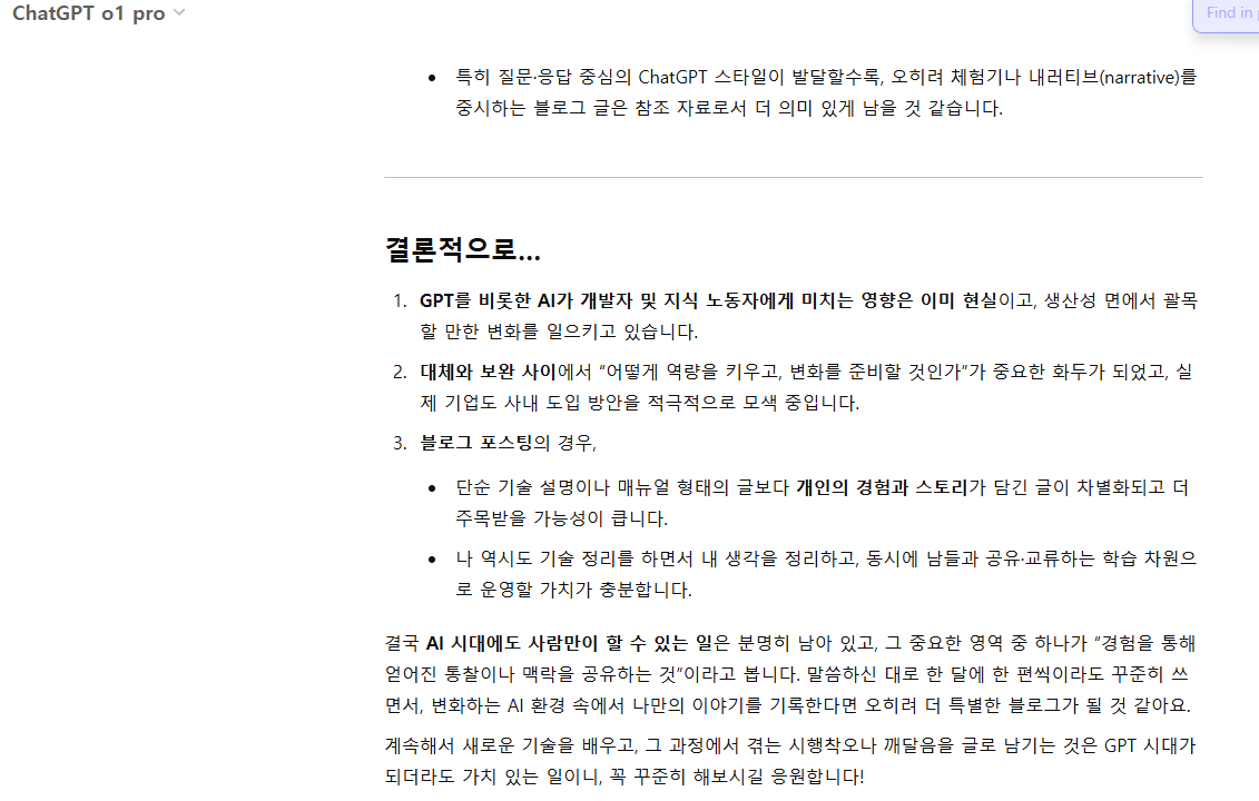 또한, 블로그에 대해서도 여러 생각이 들었다. 사람들은 이제 구글 검색보다는 GPT 같은 LLM을 더 많이 사용할 텐데(당장 나부터 구글보다는 GPT 활용), 기술 설명 포스팅이 과연 의미 있을까 싶었다. 물론 내 블로그는 내가 공부한 내용을 정리하는 목적에 가까웠지만, 앞으로는 기술 설명보다는 나의 경험에 대한 글을 더 쓰게 될 것 같다.