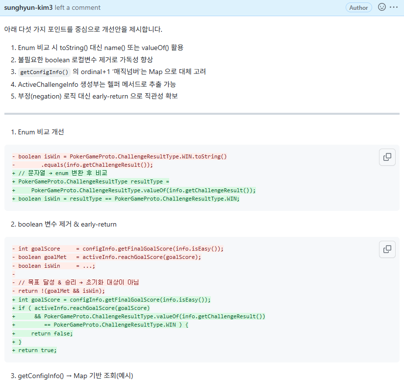 - 파일별로, 그리고 중요한 수정 사항에 대해 네이밍, 성능, 가독성을 중점으로 보는데, 정말 문제되는 코드 부분 5개 이하로 리뷰하고, 수정 코드를 보여주세요