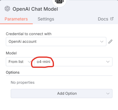 - OpenAI Chat Model 노드는 Agent가 사용할 LLM(모델)과 API 키 인증을 제공.