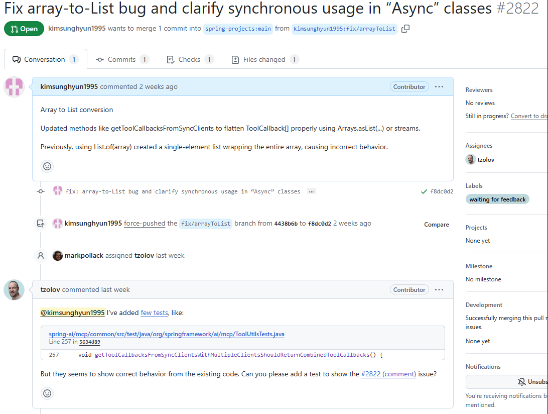 결과적으로 merge되어 Spring-AI의 공식 컨트리뷰터(contributor) 가 되었습니다!