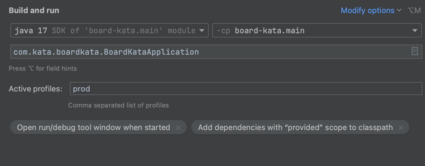 만약 위 처럼 Active profiles 설정이 없다면 modify option을 선택하여 Add VM options을 추가한 후